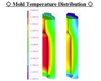抗氧化性:由于模具直接接觸的玻璃液溫度均較高,故氧化過程就進行得很快,但當接觸溫度低于500℃時,鑄鐵材料的氧化進行得很緩慢。大部分模具的損壞原因都是由氧化引起的,故在工藝允許的前提下適當降低成型溫度,有利丁延長模具的使用壽命。用風冷對模具實施最有效的冷卻就顯得尤為重要,下圖是一排垂冷孔和兩排垂冷孔對模具冷卻的模具溫度模擬。我司現以試用三排垂冷孔的冷卻方式。成模的外表面溫度降到200度一下。