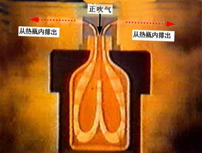 在成模中正吹氣(Final Blow ),一般我們從正吹氣開始到結束均使用單一的氣壓。而在正吹氣后一段時間里,如氣壓過低則會造成熱瓶內部排熱效果不良,造成熱玻璃瓶過軟從而產生各類缺陷以及影響到機速不能提高。眾所周知當初模料胚吹漲后,此時玻璃液已經緊貼成模模壁,此時玻璃外表面已迅速冷卻下來,而熱瓶的內部卻得不到充分的冷卻,熱瓶內部高溫不減。形成了外冷內熱的所謂“外焦里嫩”現象。此時我們應該迅速加大正吹氣壓力,它一可使玻璃的熱量繼續傳遞到成模上,二可將熱玻璃瓶內部進行冷卻(Internal Cooling)通過吹氣頭將熱瓶內的熱量大量排出瓶外,這樣內外結合可加速玻璃瓶的冷卻定型。見圖一。
