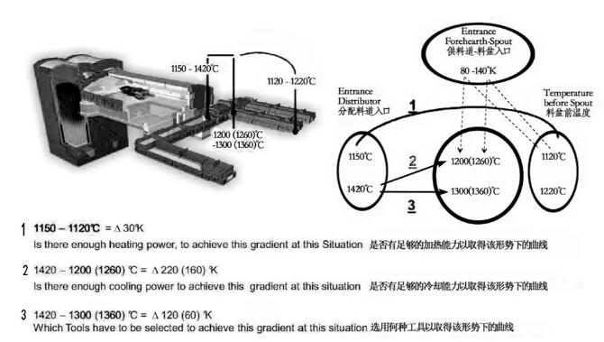 2)分配料道的溫度可調范圍跨度較寬,而玻璃液在供料道內的調整幅度僅僅只有80~140℃的極小調節范圍。因此,它必須要滿足供料道入口的溫度指標要求(1150~1300℃)。該項溫度指標對成型工藝則是剛性的要求。