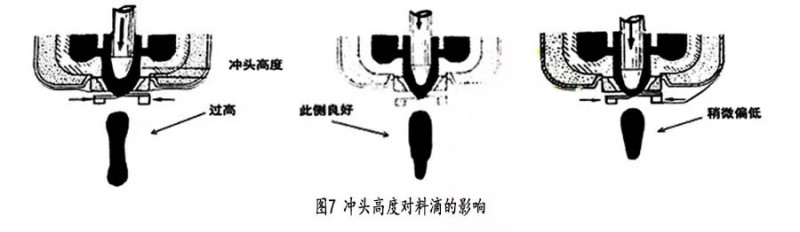降低沖頭高度在形狀上和沖程調大大體上具有同樣的效果,但嚴格說起來不一樣,希望作料滴前端(或下端)的形狀時,上升沖頭高度、調大沖程和降低沖頭高度、調小沖程當然是不一樣的。