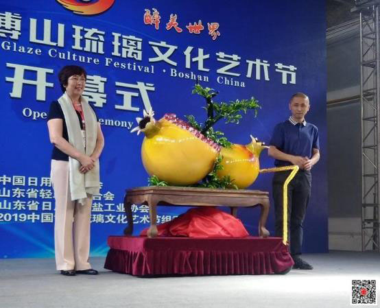 開幕式上,孟令彥、鄭舞虹、畢榮青、王樹槐、王濟眾、劉忠遠共同啟動2019中國博山琉璃文化藝術節。中國日用玻璃協會向中國玻璃藝術大師孫奉柱授予“中國琉璃葫蘆孫”榮譽稱號;發布了2019中國博山琉璃文化藝術節標志作品——世界最大的琉璃石榴;介紹了故宮與博山琉璃合作情況;發布了國家文化出口基地成果;淄博美陶瓷器有限公司與中科建集團山家文旅(淄博)有限公司簽約;淄博愛美琉璃制造有限公司、淄博康乾琉璃藝術品制造有限公司與香港藝思公司聯合成立淄博博思琉璃制品有限公司(琉璃研發設計中心)揭牌;授權博山區有代表性的琉璃企業使用“博山琉璃”地理標志。