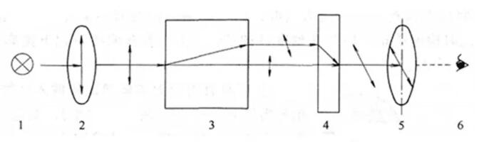 應力儀的工作原理如圖2所示。由光源1發出的光經起偏鏡 2 后,變成平面偏振光(假設其振動方向為垂直方向),當旋轉檢偏鏡 5 與之正交時,偏振光不能通過,用眼睛 6 觀察時視場呈黑色。若在光路中放入有應力的玻璃試樣 3 時,該偏振光通過玻璃后被分解為具有程差的水平偏振 光和垂直偏振光。當兩束偏振光通過1/4 波片 4 后,被合成為平面偏振光,但此時的平面偏振光的偏振面對起偏鏡產生的平面偏振光的振動方向有一個角的旋轉。因此,在視場中就可看到兩條黑色條紋隔開的明亮區。旋轉檢偏鏡,重新使玻璃中心變黑,根據檢偏鏡的角度差,就可計算玻璃的光程差。