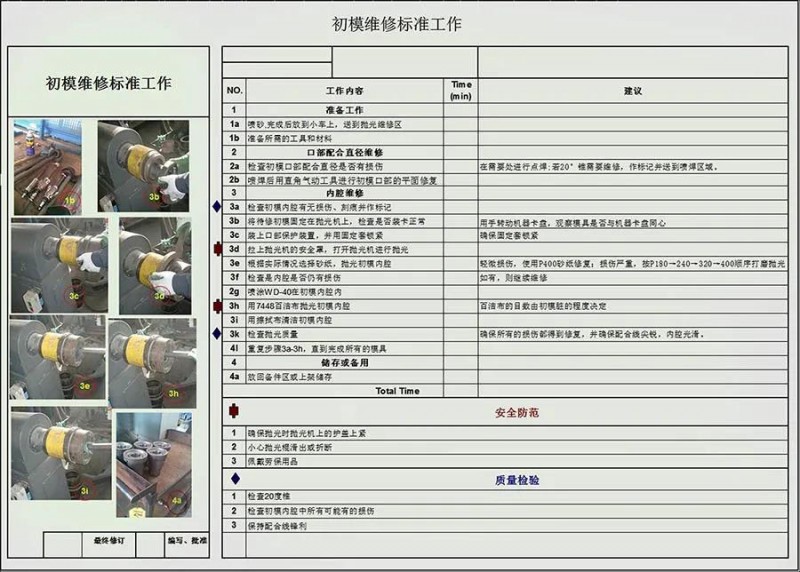 6 對各模具維修工序作出標(biāo)準(zhǔn)化作業(yè)程序,用于日常維修人員的培訓(xùn)及工作。
