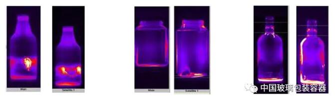 根據這些圖片,可直觀監測產品的玻璃分布、垂直度、形狀、直徑等情況,將部分有缺陷的產品直接在機前輸瓶機上剔除,避免這些缺陷產品進入冷端。如下列三組圖片(圖6)分別展示了對“Bird swing”、“Thin bottom”和“Choked neck”的檢測情況。
