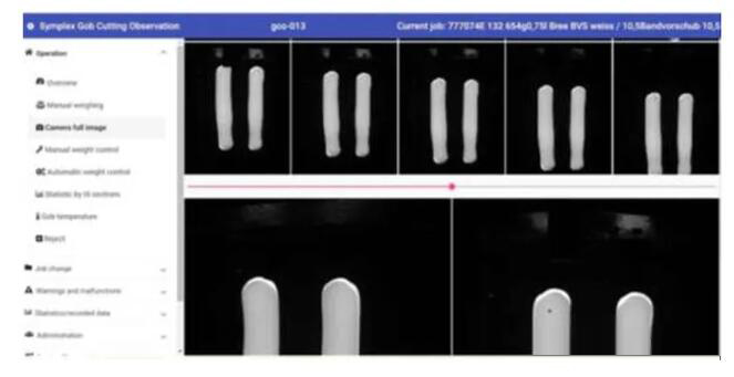 德國的Symplex公司的料重自動控制系統簡稱GCO(Gob Cutting Observation)(注:Symplex公司已被Emhart公司收購,國內現由Emhart公司旗下的三金公司提供該技術)。GCO系統在剪刀機構下方的合適位置安裝兩臺攝像機(根據現場情況決定安裝位置,再采用適合相應距離的鏡頭),這兩臺攝像機以一定的角度對準料滴,拍攝每一個下落料滴的圖片(圖8)。