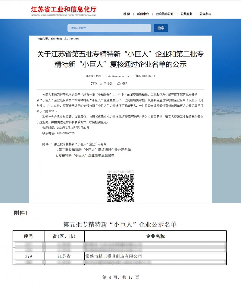 7月14日,江蘇省工業和信息化廳發布了工業和信息化部組織開展的第五批專精特新“小巨人”企業名單,精工模具憑借在高端玻璃模具領域的創新型成果成功入選為國家級“專精特新”小巨人企業。