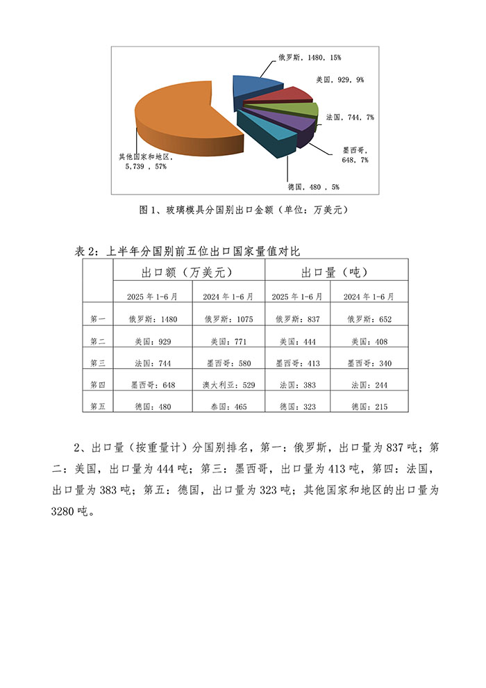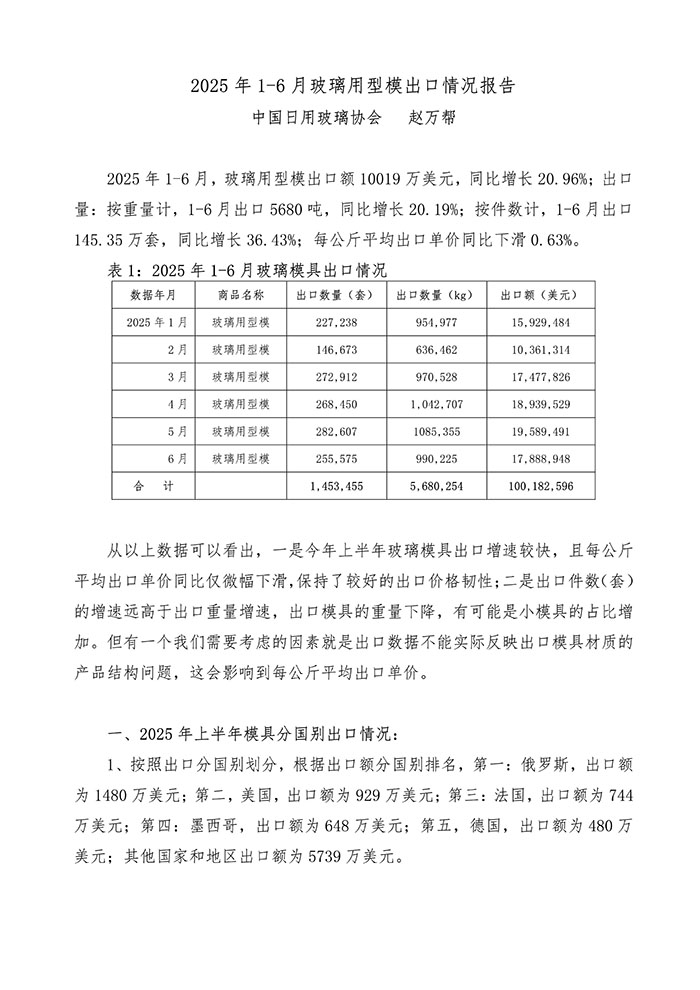 核心提示:2025年1-6月日用玻璃模具出口情況